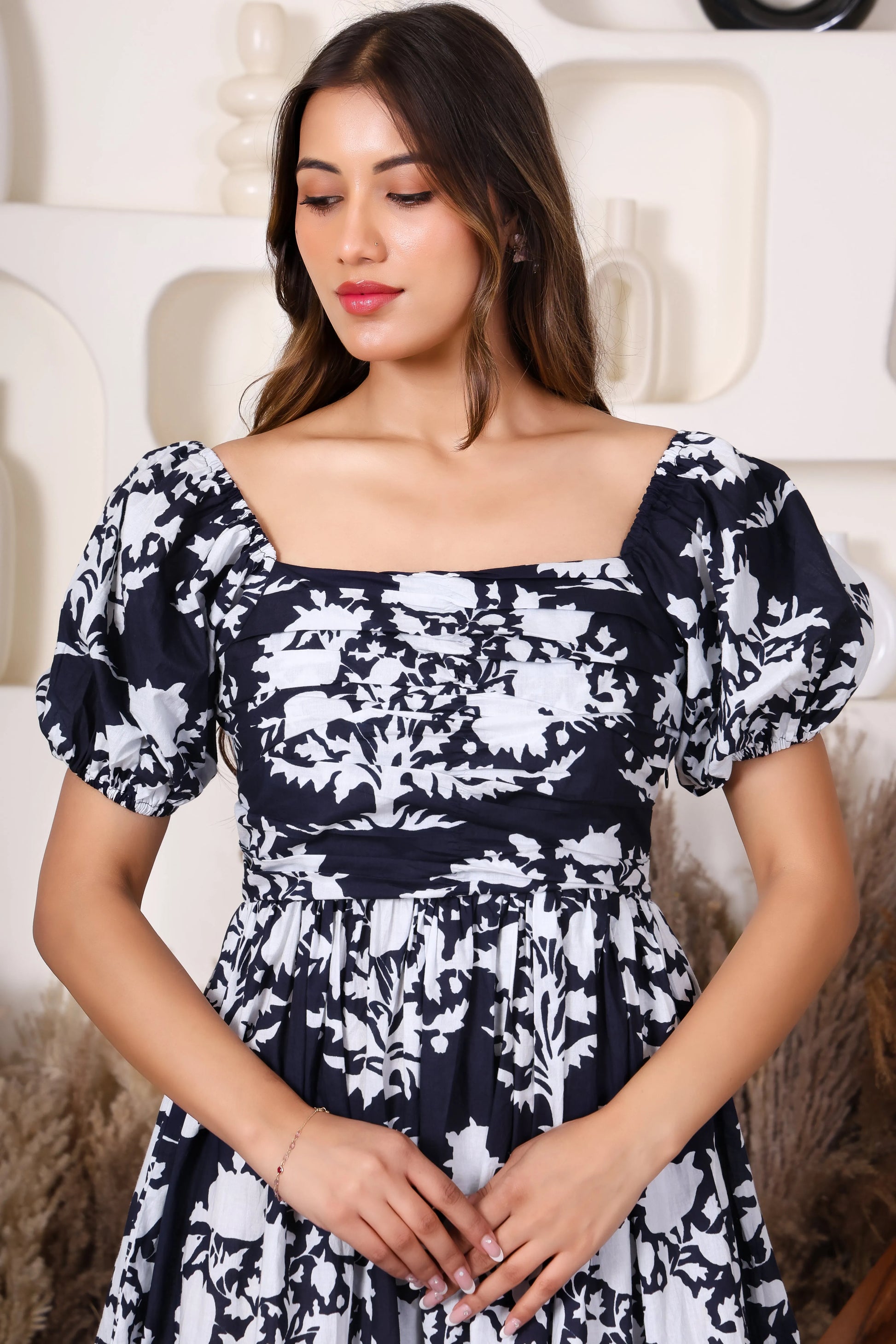 The dress features a square neckline with soft gathers and puffed sleeves for a feminine touch. A cinched waist flows into a flared mini skirt, while the monochrome floral print adds charm to this playful yet elegant silhouette.