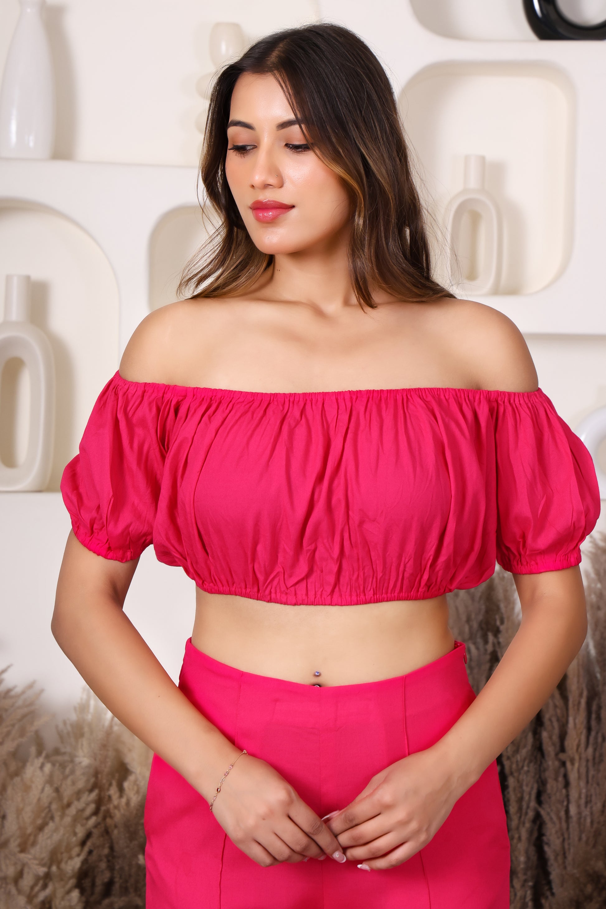 A flirty off-shoulder crop top with gathered puff sleeves pairs perfectly with sleek high-waist pants featuring front slits. The look is bold, feminine, and effortlessly stylish—perfect for a statement-making day out.
