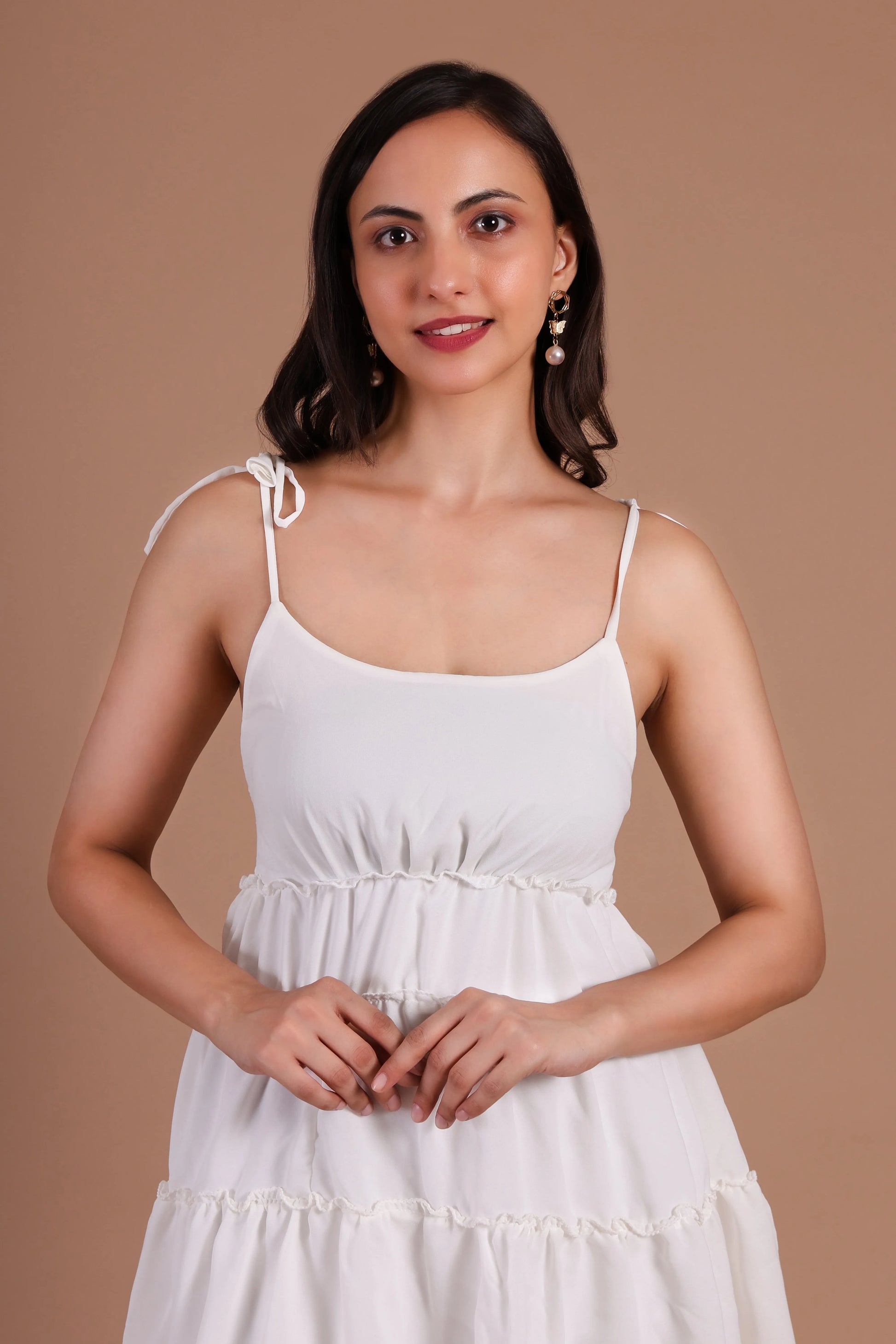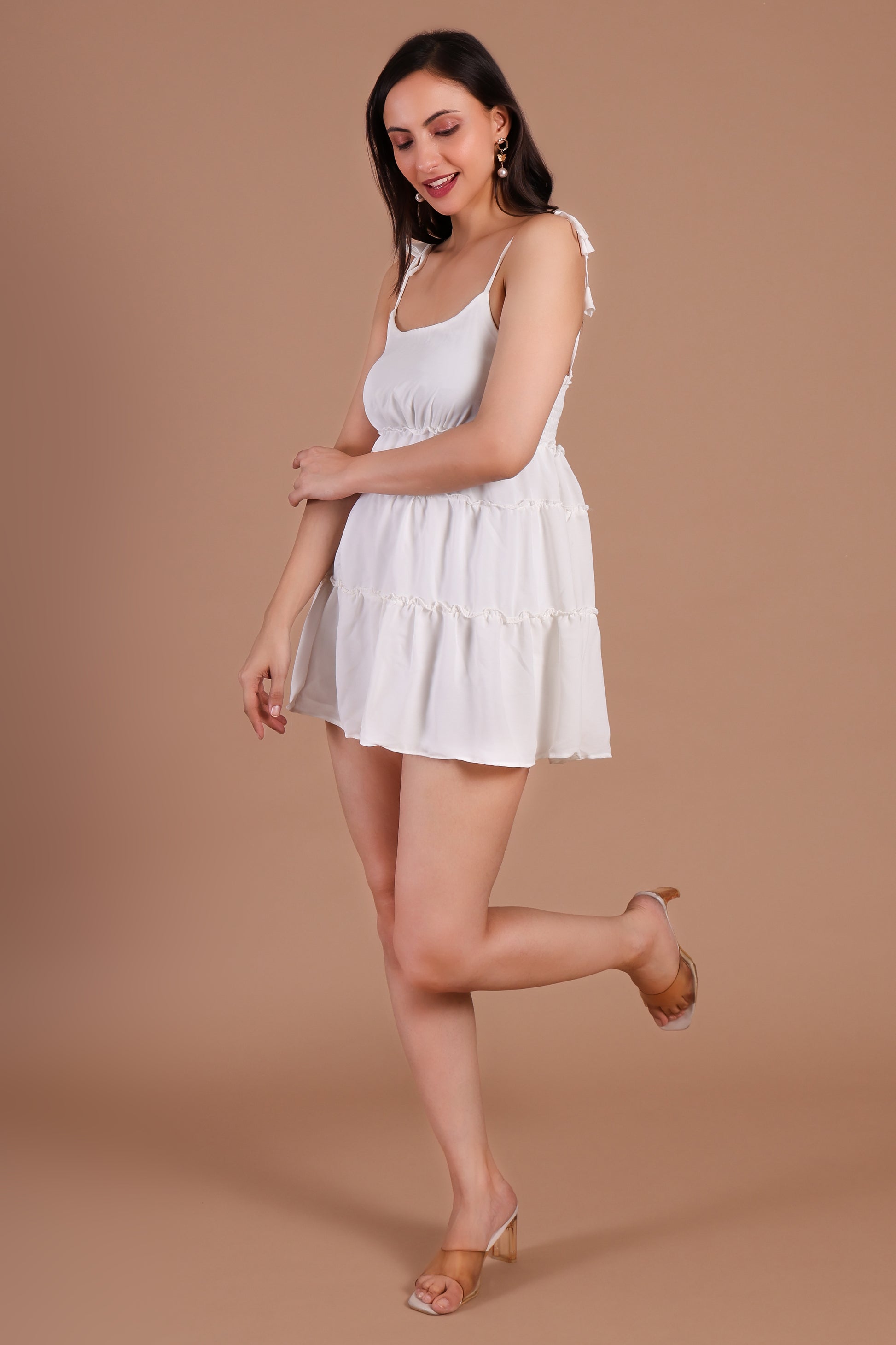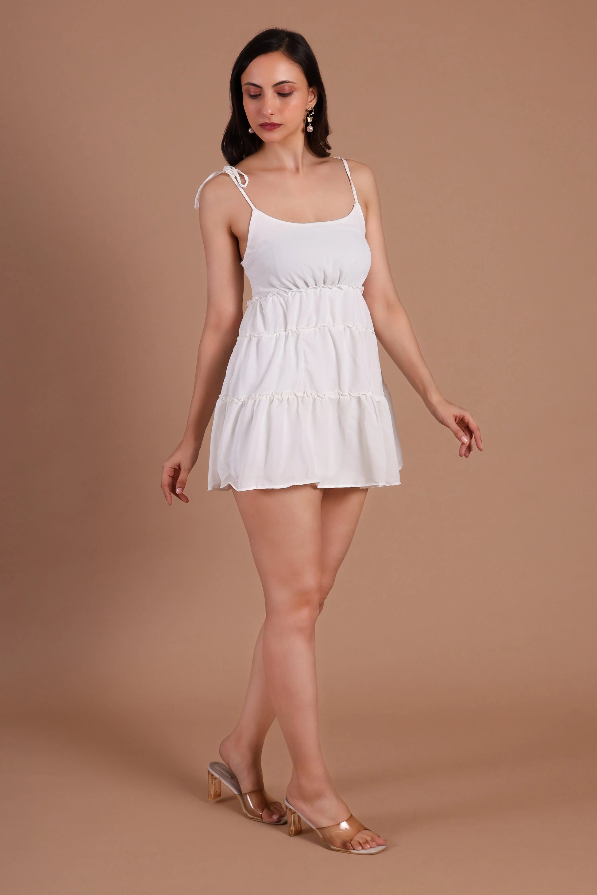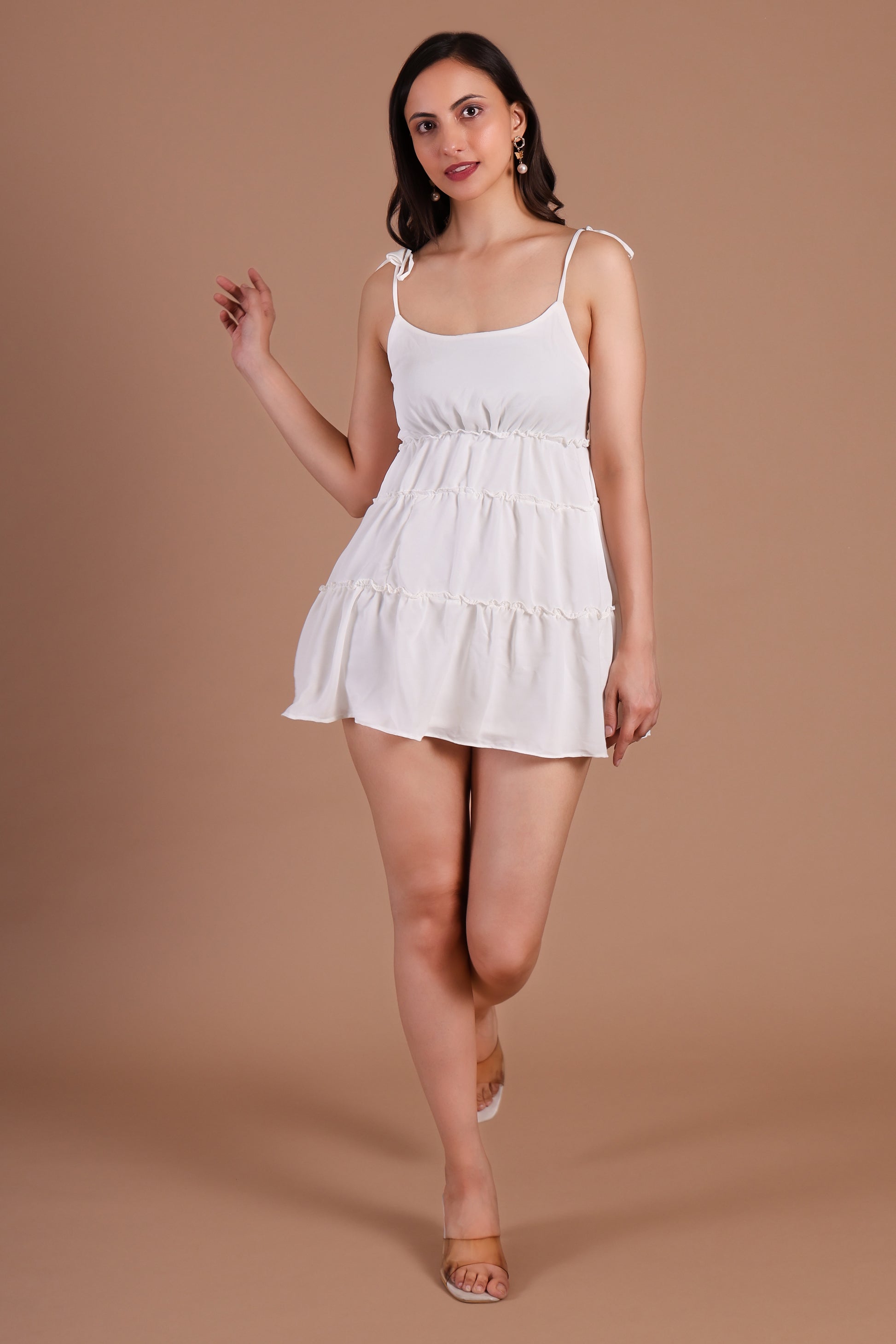 Tiered mini dress with soft gathers Tie-up shoulder straps for adjustable fit Scoop neckline and cinched waistline Lightweight and breezy silhouette