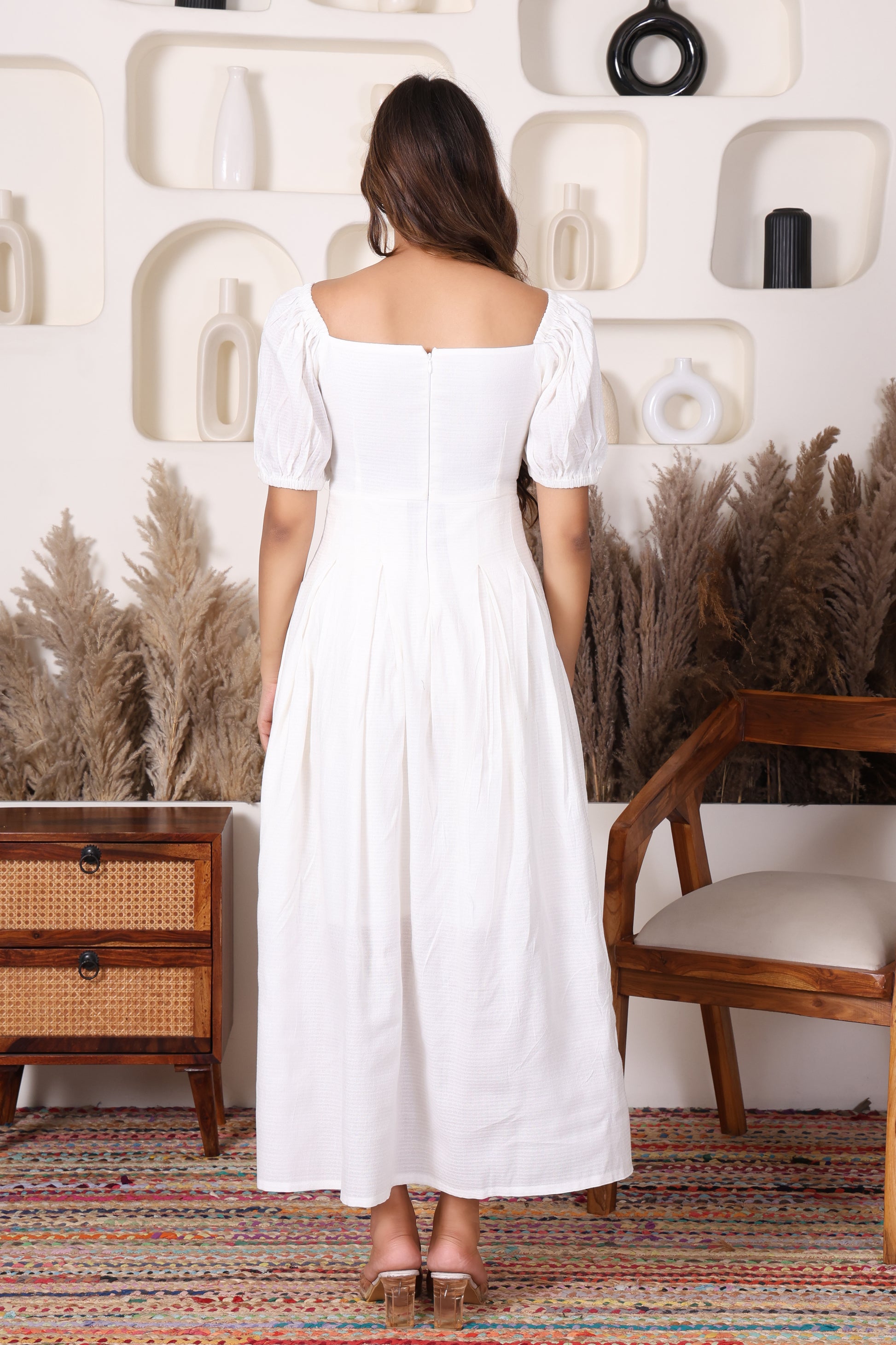 Our Moonlight Pleats Dress is soft, structured, and utterly dreamy, the perfect example of understated elegance. With a square neckline, voluminous puff sleeves, and elegant box pleats, this full-length dress is ideal for brunch dates, sundowners, or any occasion where effortless grace is a must. Made from self-textured cotton, it offers both comfort and timeless charm for your wardrobe.